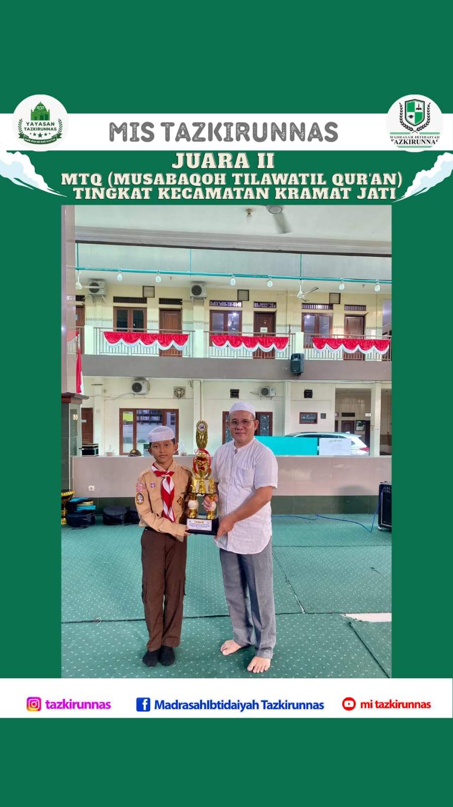 Prestasi membanggakan kembali diraih oleh MIS Tazkirunnas. Pada ajang Musabaqah Tilawatil Qur’an (MTQ) tingkat Kecamatan Kramatjati yang diselenggarakan pada Rabu, 13 Agustus 2025, salah satu siswa MIS Tazkirunnas, ananda Muhammad Habibie Syafiq, berhasil meraih Juara 2. Keberhasilan ini menjadi bukti nyata dedikasi siswa, guru, serta dukungan penuh dari madrasah dalam mengembangkan potensi peserta didiknya.