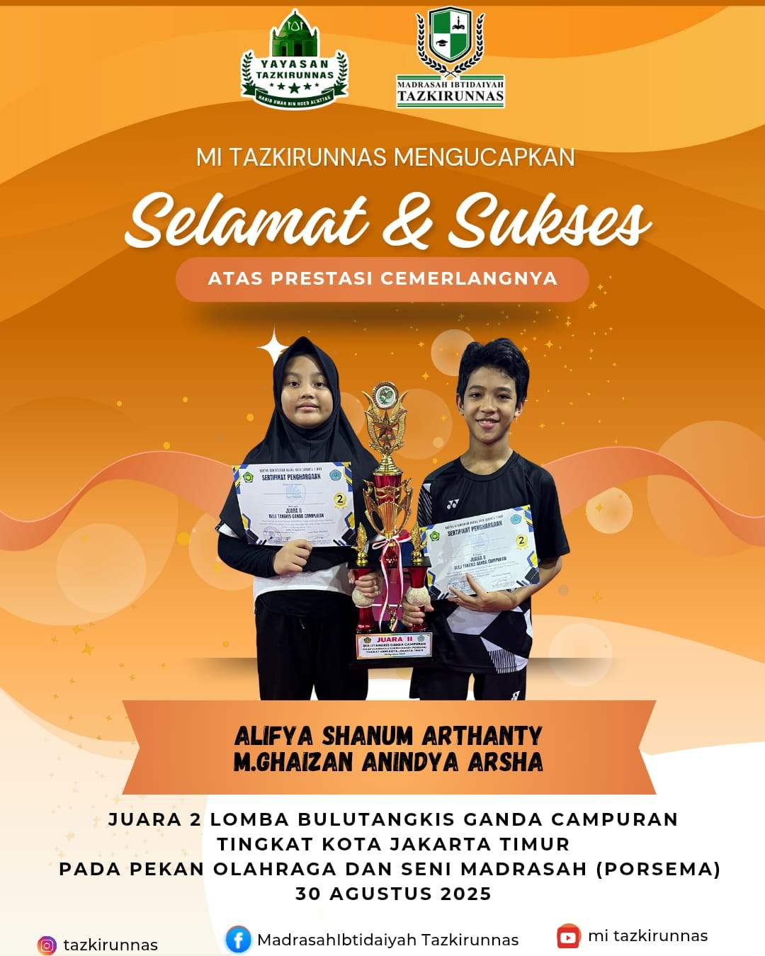 Prestasi kembali diraih oleh siswa MIS Tazkirunnas melalui cabang olahraga badminton. Pasangan ganda campuran, Muhammad Gaizan dan Alifya Shanum Arthanty, sukses meraih Juara 2 pada Kejuaraan Badminton Tingkat Kota Jakarta Timur 2025. Pertandingan final ini berlangsung di GOR Garda Juara Badminton Cipayung pada Sabtu, 29 Agustus 2025, dengan menghadirkan persaingan sengit antar sekolah dan madrasah terbaik se-Jakarta Timur.